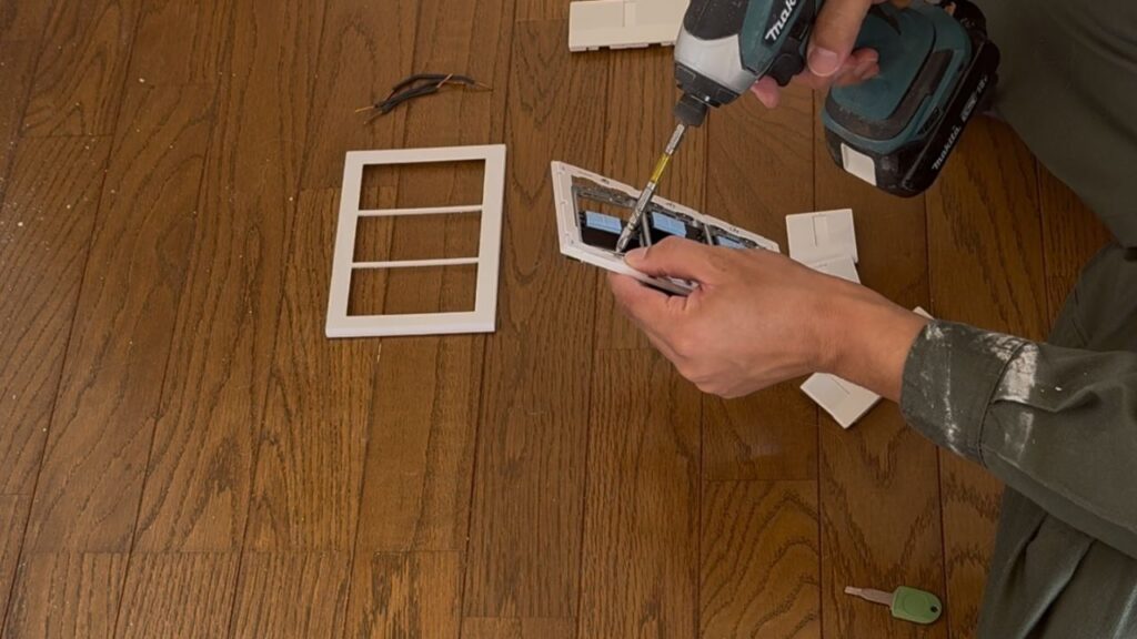 取り付けプレートに金属の取り付け枠をドライバーで取り付ける