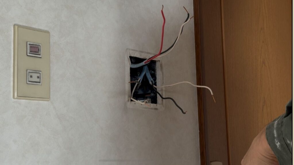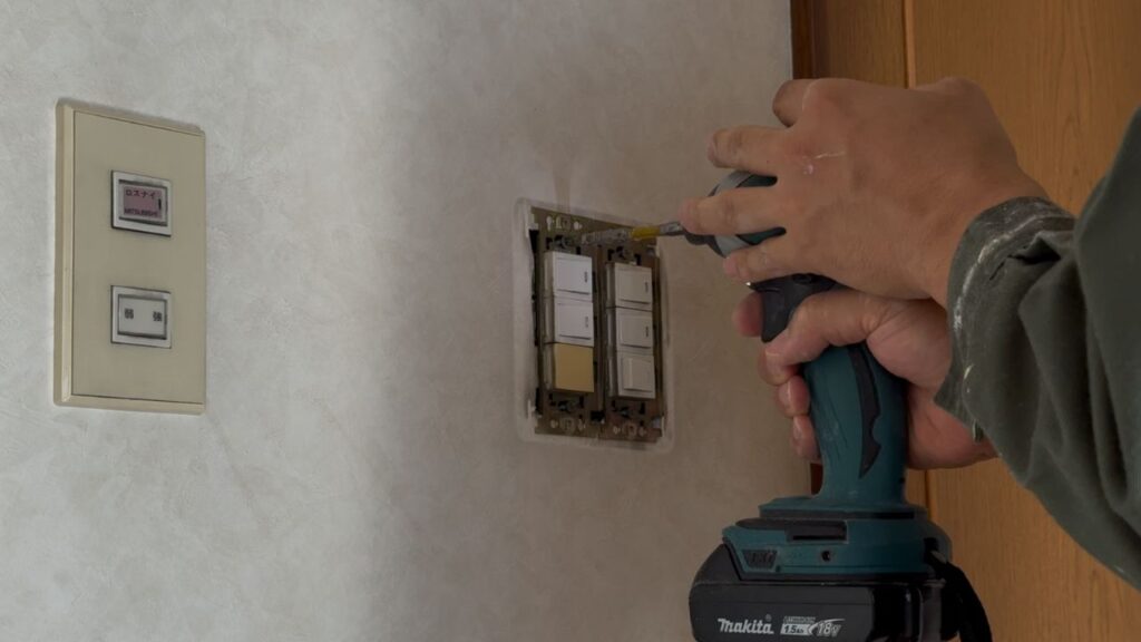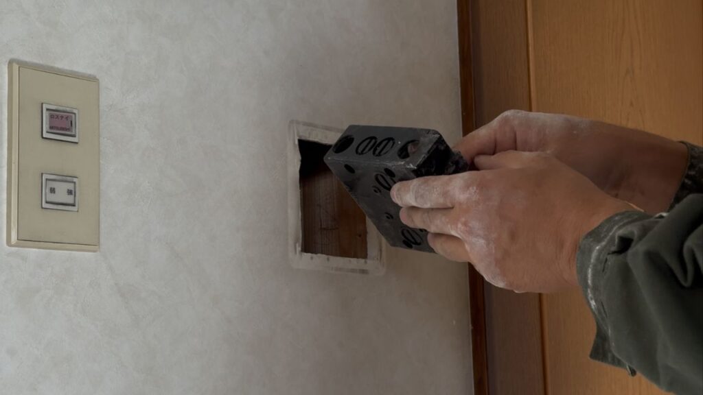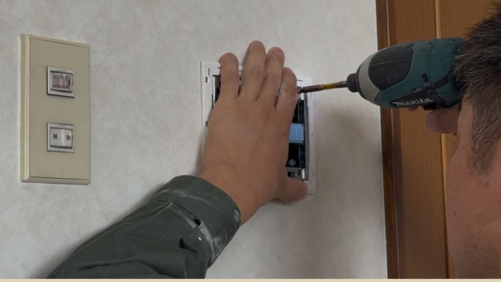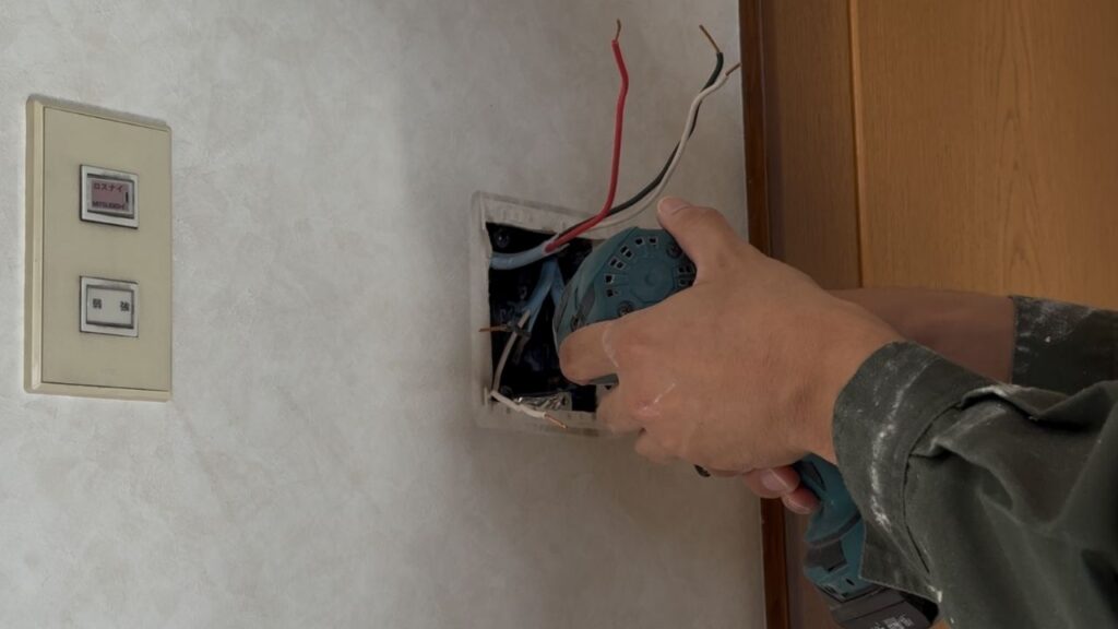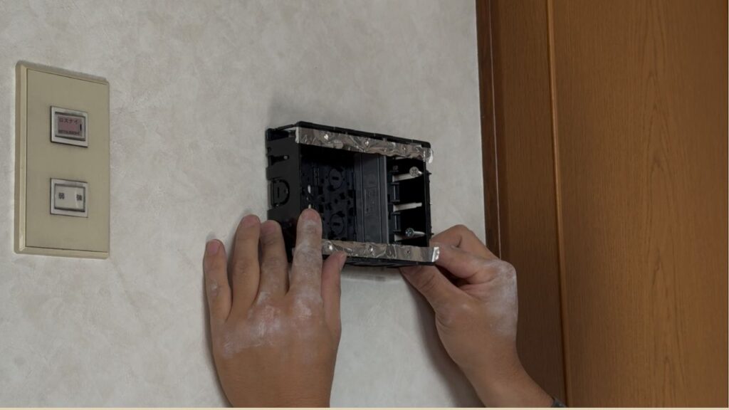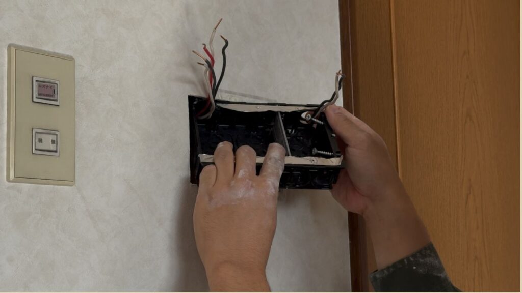 先に上部から配線を通しスイッチボックスを壁内に入れ木ねじ2本で固定する
