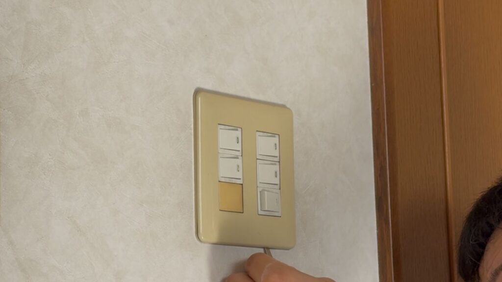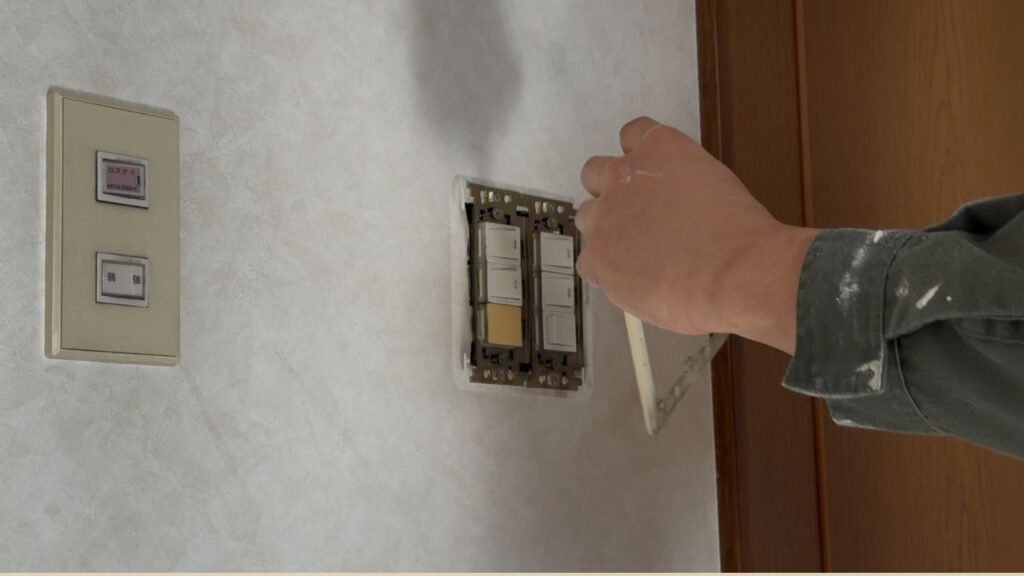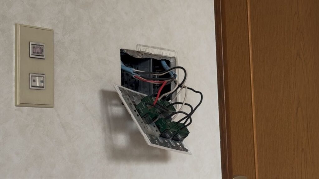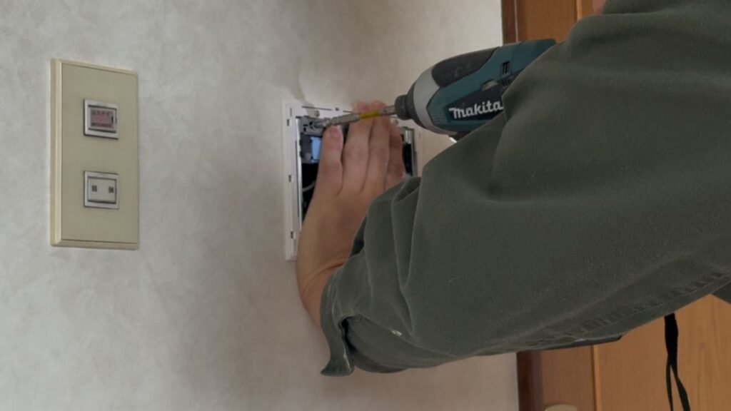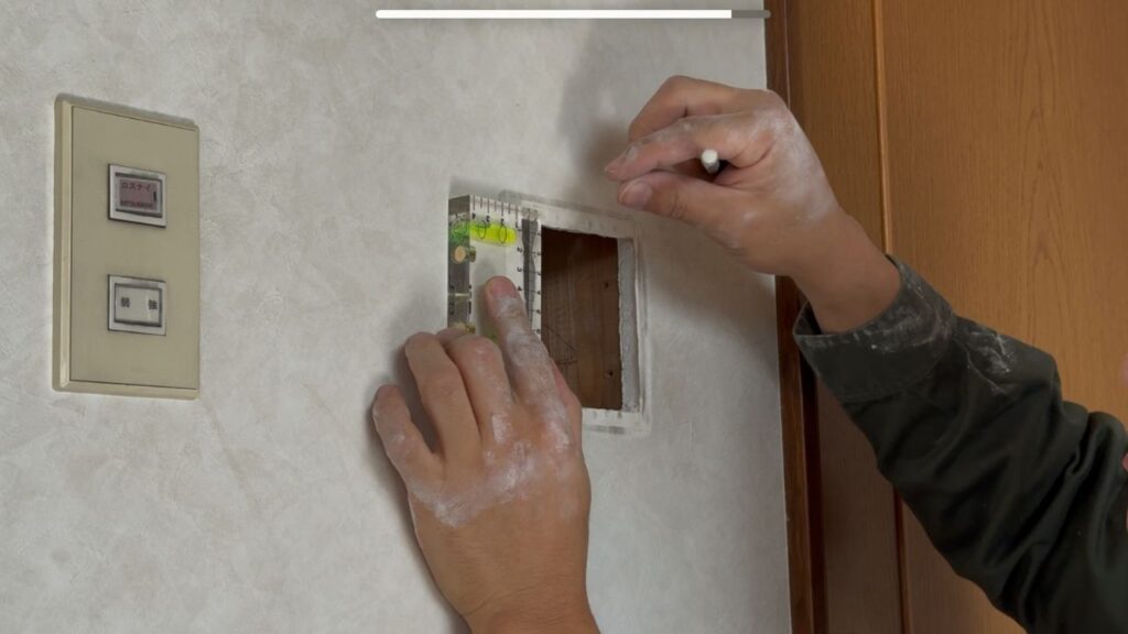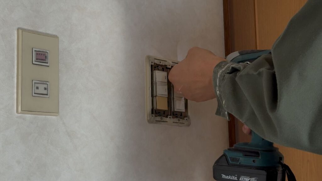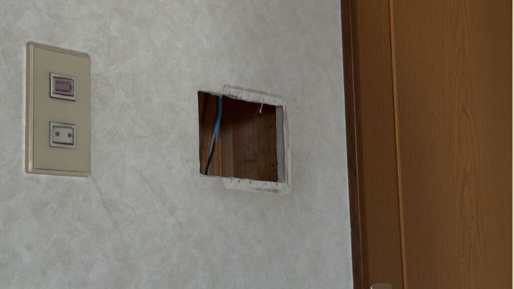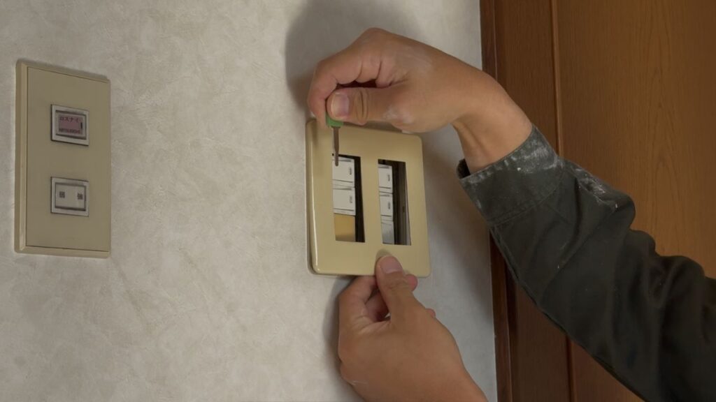 先に上部から配線を通しスイッチボックスを壁内に入れ木ねじ2本で固定する
